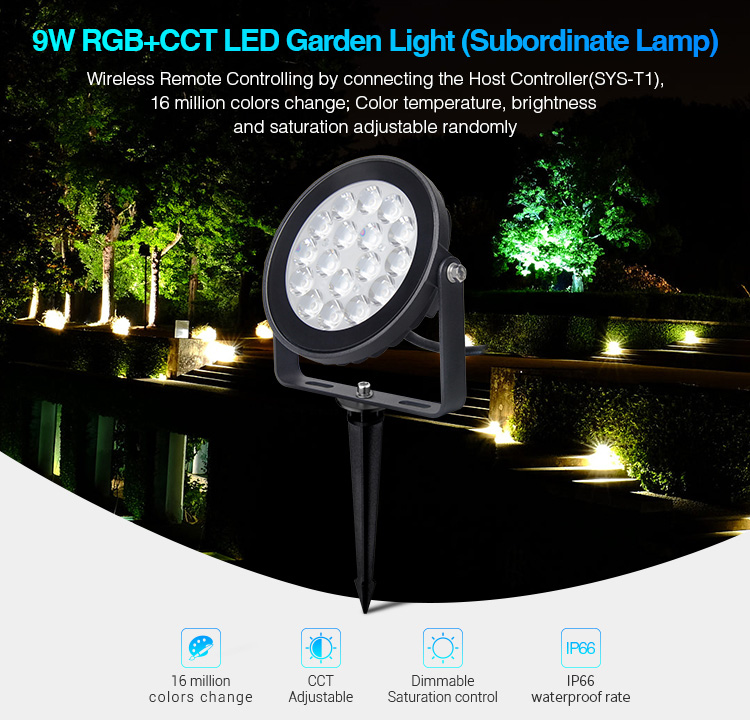 The 9W Garden Light RGB + CCT is an energy-saving lighting solution for outdoor gardens. It operates on DC24V and emits a brightness of 700 lumens with a 15-degree beam angle. Its IP65 rating ensures durability and protection against dust and water. The RGB + CCT functionality allows for customizable lighting to create various atmospheres. Overall, it is a versatile and efficient choice for outdoor garden lighting.