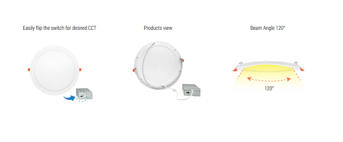 Lumipro 12" E Series LED Round Downlight, 24W, 5CCT(2700K/3000K/4000K/5000K/6000K) 1920lm, 80lm/W, 120VAC input, 11"cutout 11.81"diameter, triac dimmable, 50k hour lifetime, CRI>90, PF>0.9, ETL/ES, Wet Location, 5 yr warranty