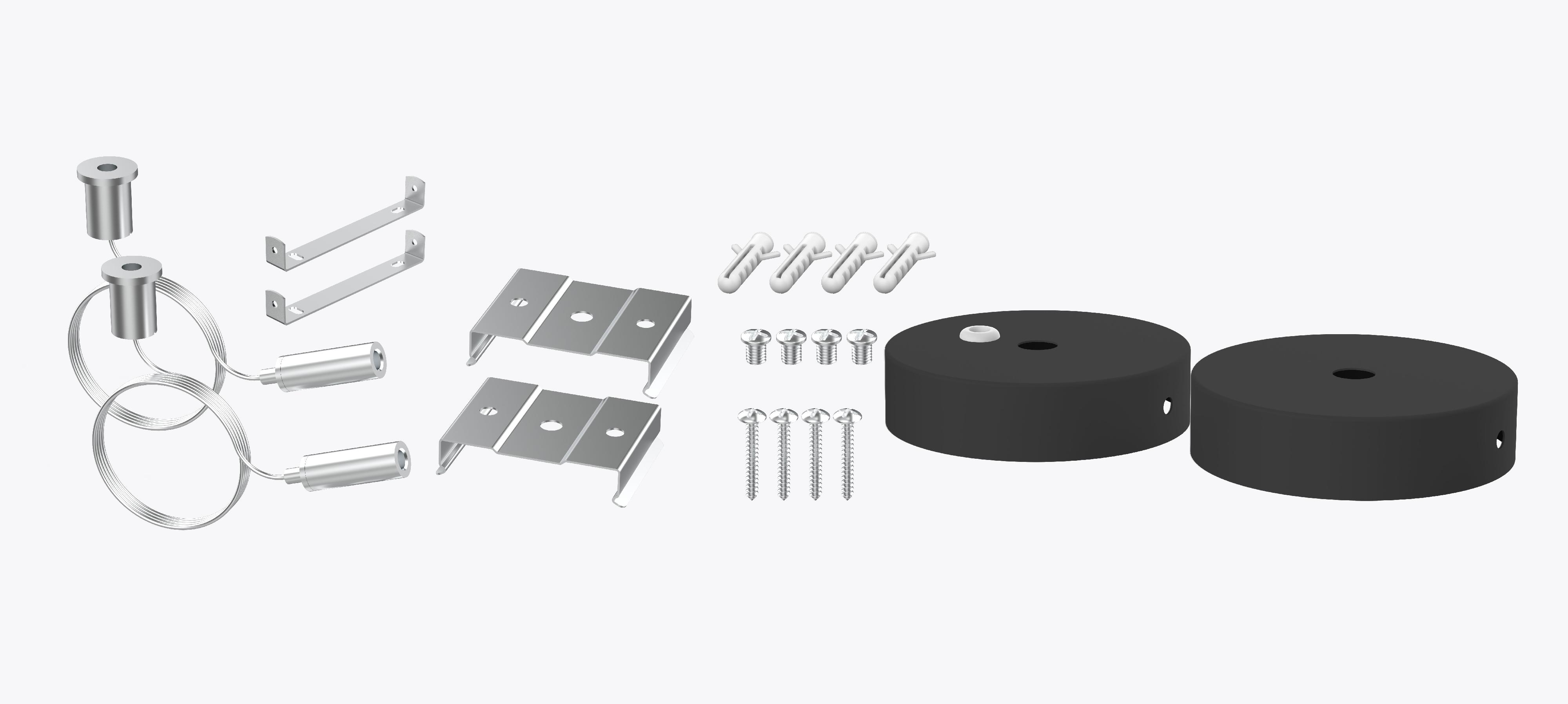 Suspended accessory for 9-P2?x2?-F frame light, includes: 4pcs 1meter hanging wire, with 1pcs round canopy box, 2pcs DC wire and screw accessory