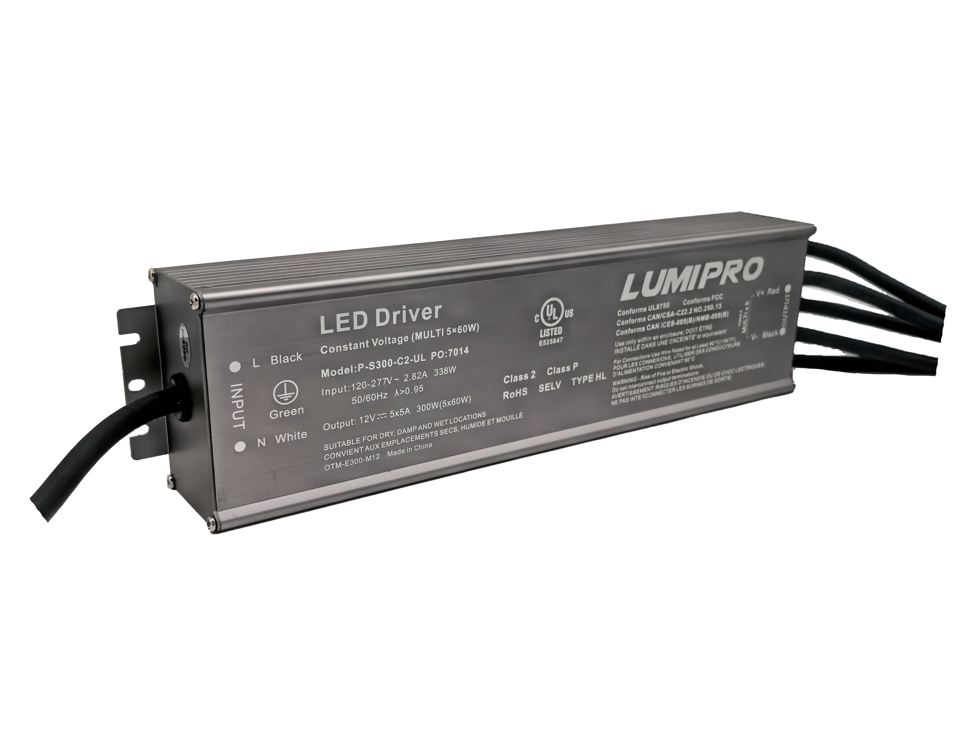 Lumipro Class 2 Series Power Supply 12VDC 300W 120-277VAC Input IP67 Work Temp -40C+60C Dim 304.4x78x46mm 7 Yrs Wrrty UL