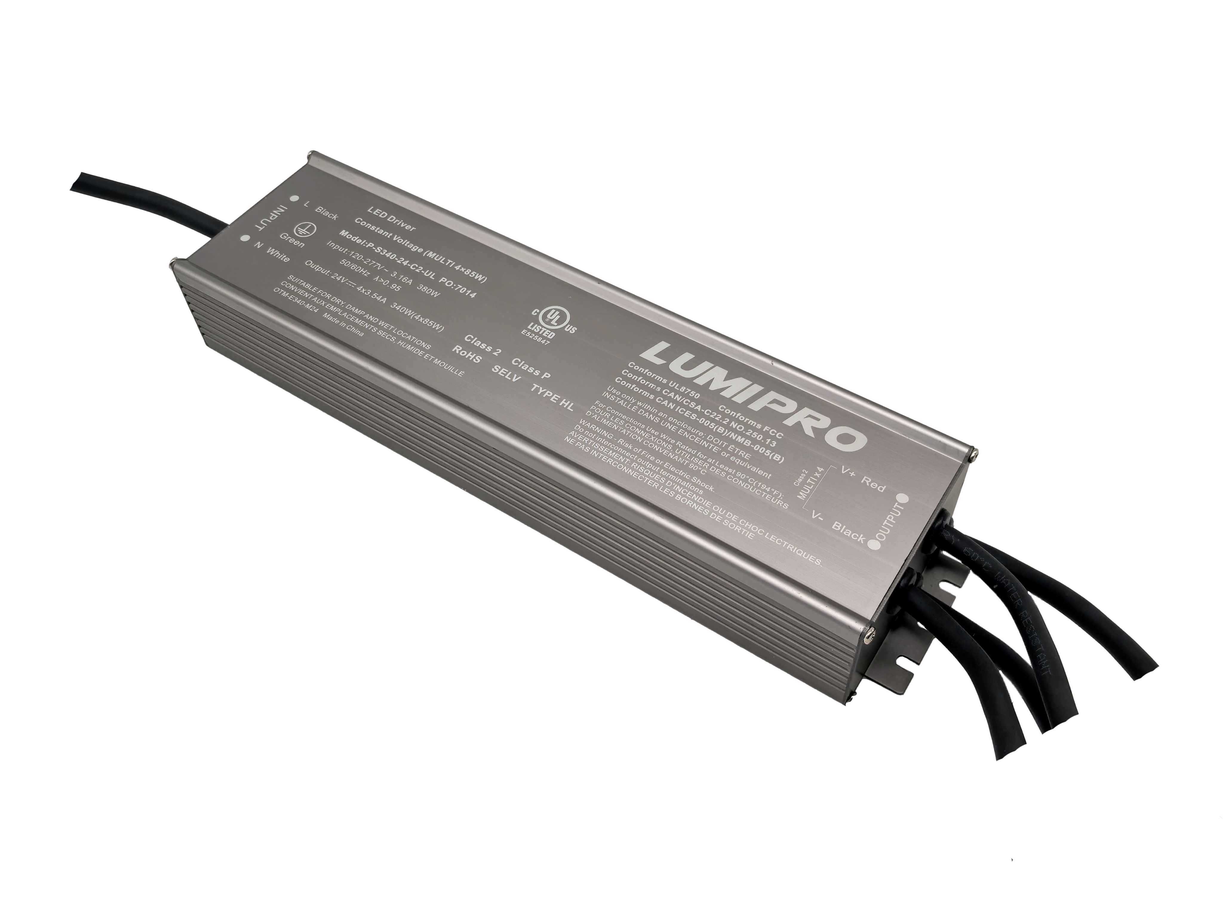 Lumipro Class 2 Series Power Supply 24VDC 340W 120-277VAC Input IP67 Work Temp -40C+60C Dim 304.4x78x46mm 7 Yrs Wrrty UL