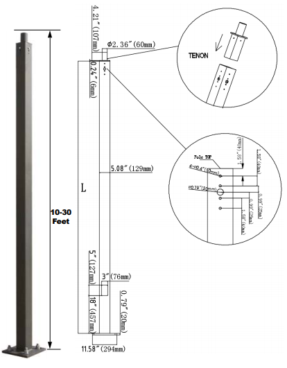 NO RETURNS 20' Steel. 4"4" Square Light Pole with 2-3/8" Top Tenon, 14 Gauge Carbon Steel, 2" round electrical hole, Wind resistance: 180MPH, Color: Bronze resin-based paint.
