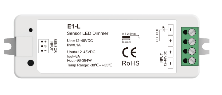 Sensor LED Dimmer, Input 12-48VDC, Max 8A output current, PIR motion sensor,CE Rosh,Op: Temp:-30C to 55 C,33x97x18 mm, IP20, 5 yrs Wrrty