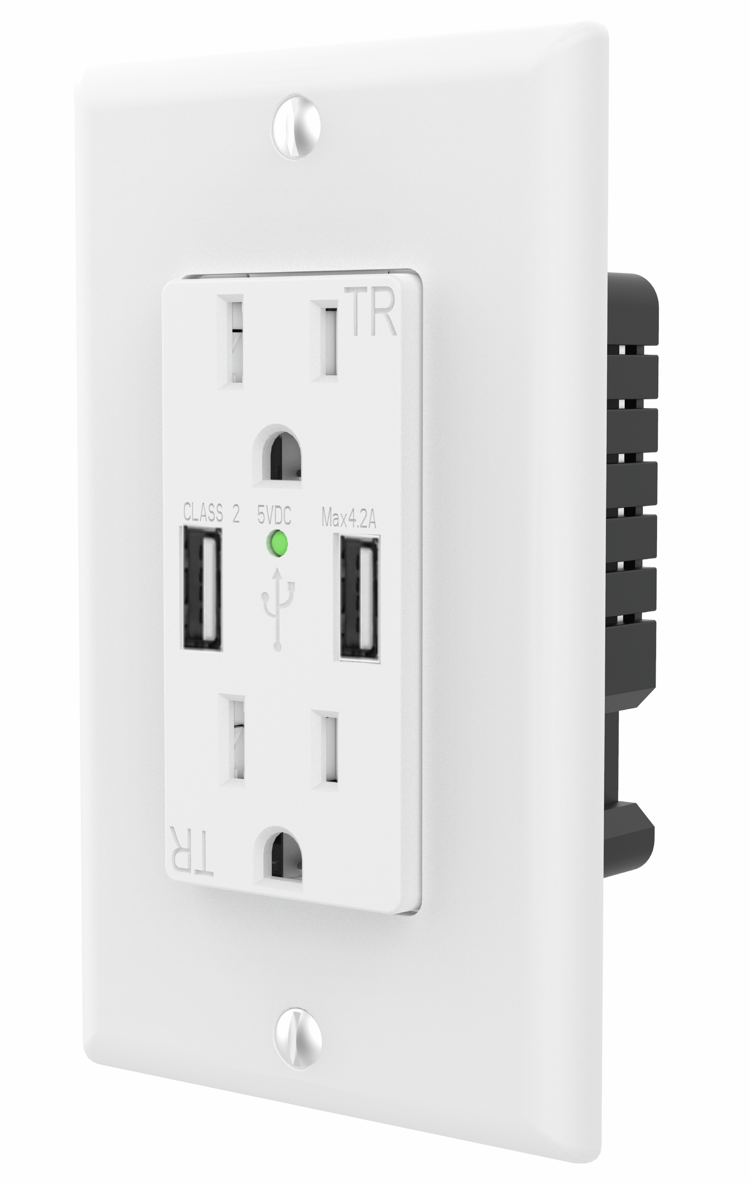 UL Listed Duplex USB Receptacle, Commercial Grade, White, 15A, 100-250V, FCC, 5V 4.2A for USB ports for fast charging, Tamper-Resistant Shutters, Side Wired & Back Wired, LED indicator, Side Wired & Back Wired