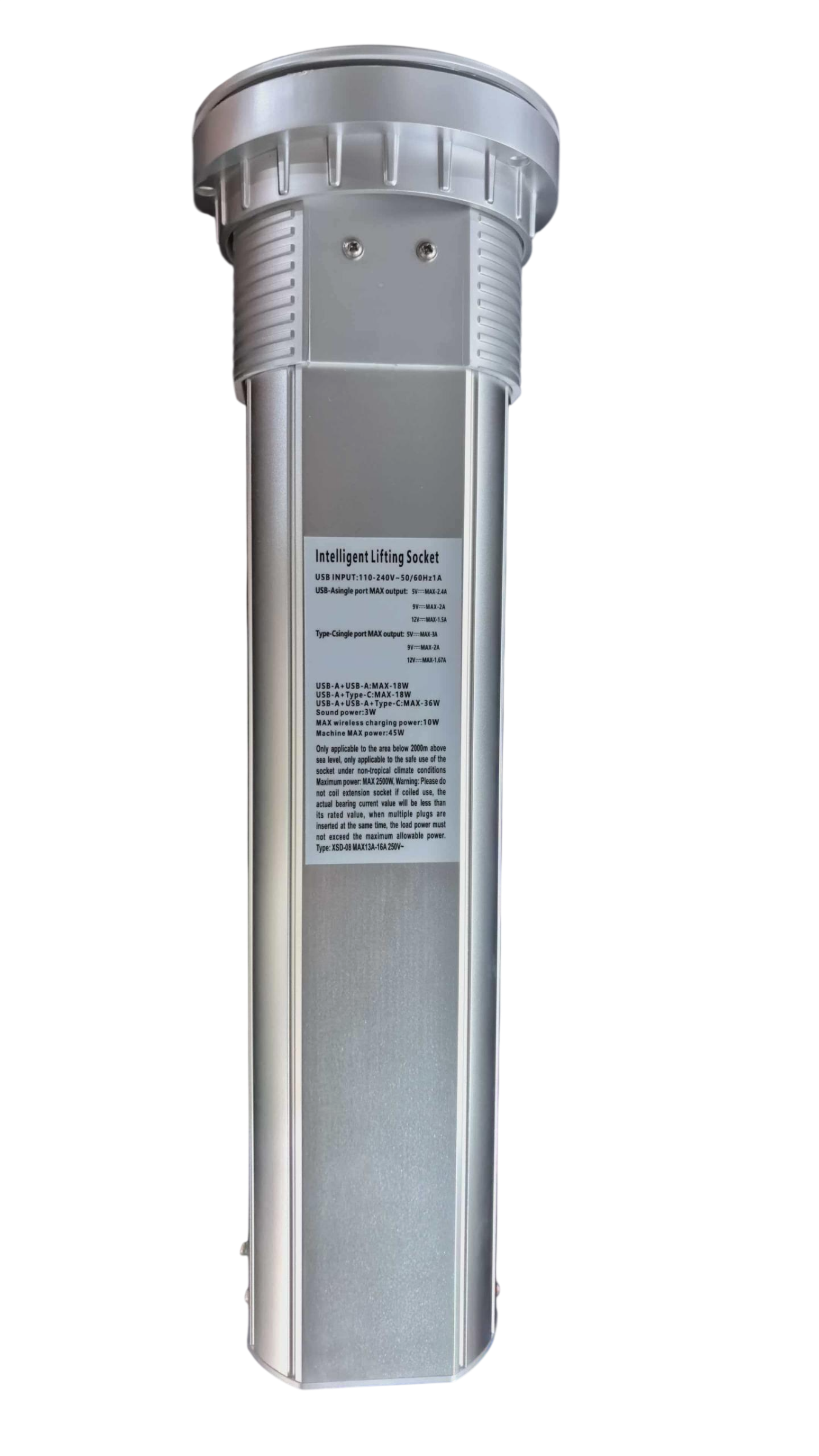 Silver Electric Outlet 2 AC socket+USB 2A and C+Bluetooth speaker+wireless charging. Hole Size: 100-102mm 10AV - 16A 2500 W Power Cord Lenght: 1M IP44 UL Listed